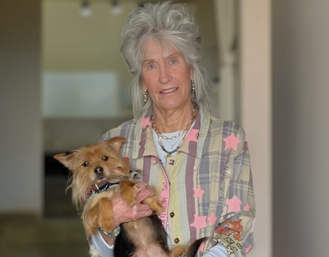 Pictured with her is her right-hand man, Walter — the rescue dog who, as she likes to say, rescued her.